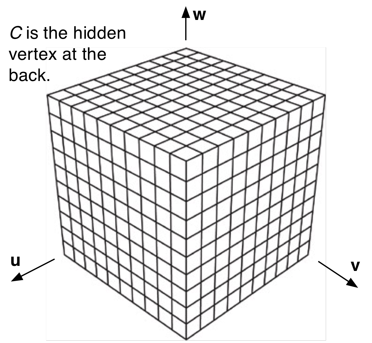Example: Several physical processes (CT scans, MRI, etc.) and/or simulation algorithms produce data sets characterized as a 3D array of numeric values. So-called voxel data sets can be imagined as in the diagram on the left. There is one numeric value in each subcube of this voxel grid. The value may be a scalar (e.g., temperature, absorbance, etc.), a vector (e.g., a velocity vector), or anything else.