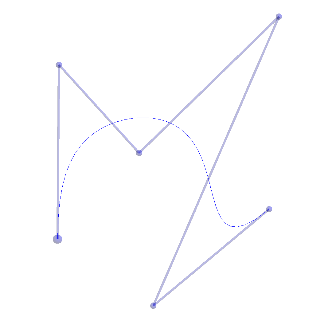 Why would we want to? For starters, C(t) will be a well-defined point for any value of t. (Right?) Moreover, it turns out that the set of points that result define a continuous curve with some very desirable properties. When drawn from t=0 to t=1, the curve starts at P0; it ends at Pn; and its shape follows that of the rest of the points in a very intuitive way. This means initial curve construction as well as subsequent modification can be extremely intuitive.